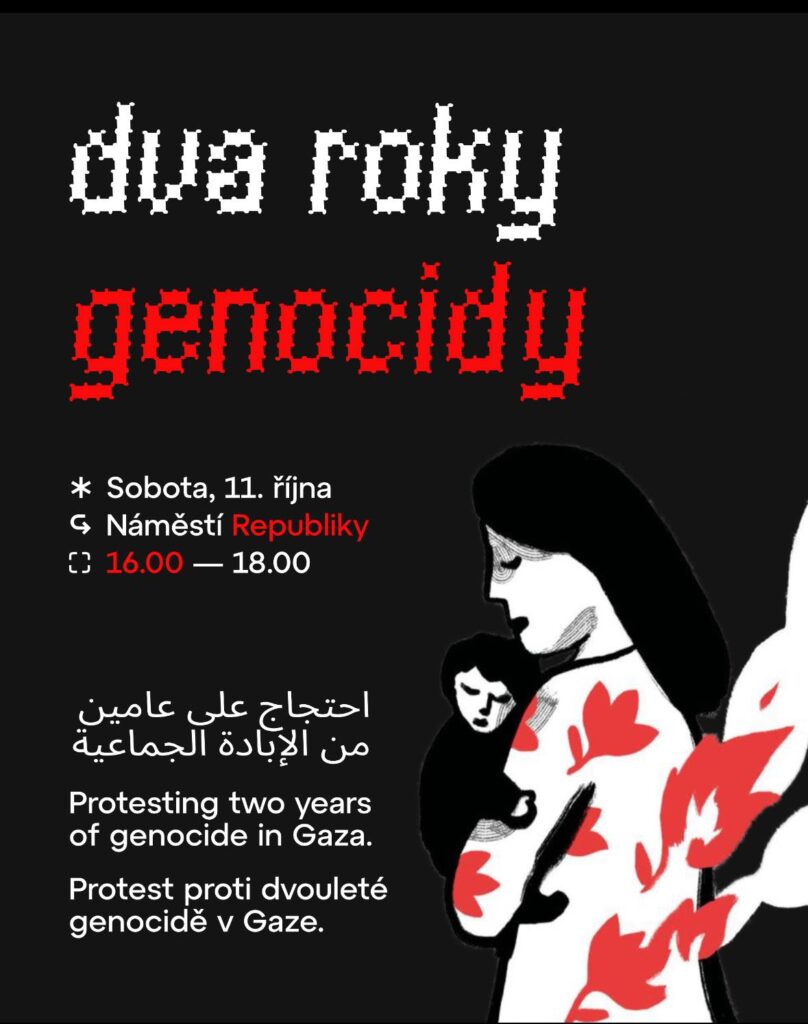 Dva roky izraelské genocidy v Gaze a dva roky české spoluviny si připomenou iniciativy propalestinské solidarity protestní demonstrací, která je svolána na Náměstí Republiky v Praze na sobotu 11. října 2025 od 16:00 hod. s následným pochodem ulicí Celetnou na Staroměstské náměstí a odtud na Palachovo náměstí a Národní třídou na Můstek.
